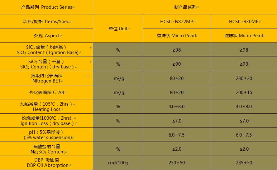 无锡恒诚硅业有限公司专业生产和研发的高分散二氧化硅,包括微珠状和颗粒状两者形态,主要用于冬季胎、轿车胎、四季胎、高性能轮胎和载重胎。公司自主研发的轮胎专用高分散型二氧化硅产品可有效降低轮胎的滚动阻力,提高轮胎抗湿滑性和耐磨性,进而提高轮胎的可操控性和使用寿命,降低油耗,更好的满足“绿色轮胎”的需求。其中:HCSIL-822MP/GR用于冬季胎(雪地胎和湿地胎);HCSIL-833MP/GR,HCSIL-860MP/GR,HCSIL-H870MP/GR用于轿车胎和四季胎;HCSIL-900MP/GR用于高性能和载重胎。执行标准:HG/T3061-2009。